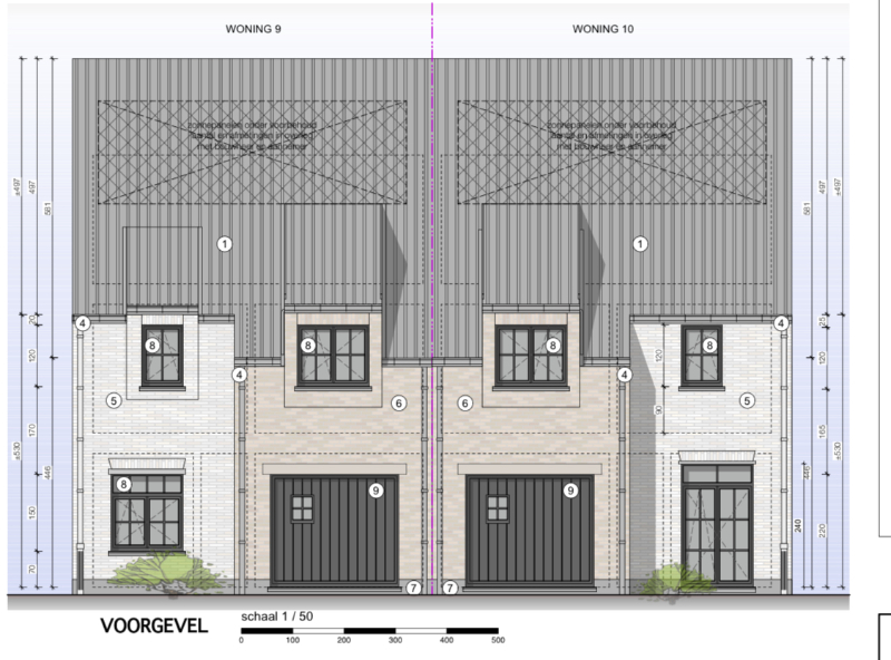 Deze knappe verkaveling bestaat uit 10 nieuwbouw half open bebouwingen in een tijdloze stijl op een mooi stukje grond (tussen de 426 en 505m2 grond). De woningen hebben volgende indeling: inkomhal, ruime leefruimte met grote raampartijen naar buiten toe, open keuken volledig zelf te kiezen, berging, inpandige garage. Op de verdieping zijn er 3 slaapkamers en een badkamer voorzien van dubbele lavabo, ligbad, inloopdouche en toilet. Vaste trap naar de zolder, welke ingericht kan worden als 4e slaapkamer, technische ruimte wordt daar eveneens voorzien. Zuid gerichte tuinen, waarvan oprit, afsluiting, terras en tuin en zelfs het tuinhuis volledig wordt voorzien ! Extra’s: overal vloerverwarming en vloerkoeling met warmtepomp, 8 zonnepanelen, verluchtingssysteem D. Start van de bouwwerken oktober 2024, oplevering maart 2026.